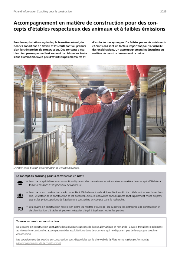 Si des questions se posent concernant un projet de construction (idée, avant-projets, planification détaillée, exécution, etc.), la Plateforme nationale d'ammoniac propose un conseil indépendant. L'étendue des conseils possibles est ensuite déterminée par les coaches et la direction du projet et dépend de différents facteurs (projet de construction, espèce animale, etc.). Les frais pour un conseil d'une certaine ampleur sont pris en charge par la Plateforme national d'ammoniac. Les personnes ci-dessous peuvent être contactées :